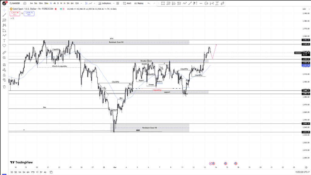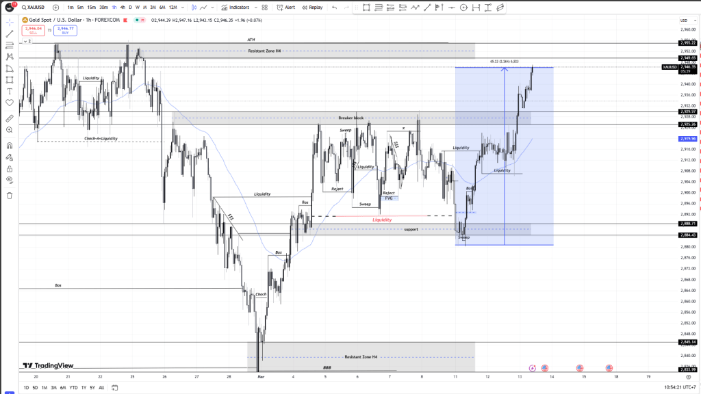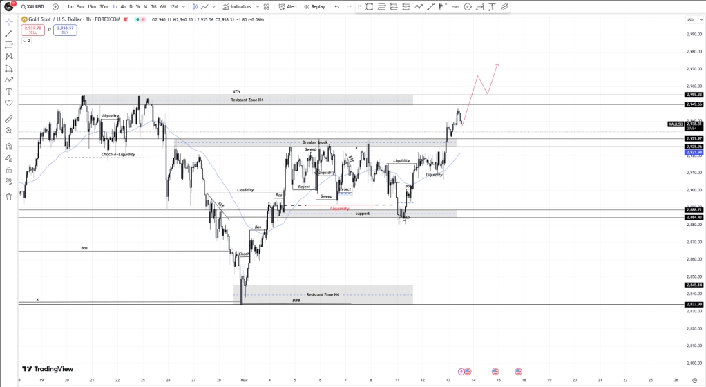 ปัจจุบันราคาทองคำทะลุแนวต้าน 2,925 – 2,929 และกำลังเคลื่อนที่ขึ้นไปทดสอบโซน 2,949 – 2,955 ซึ่งเป็นแนวต้านสำคัญ